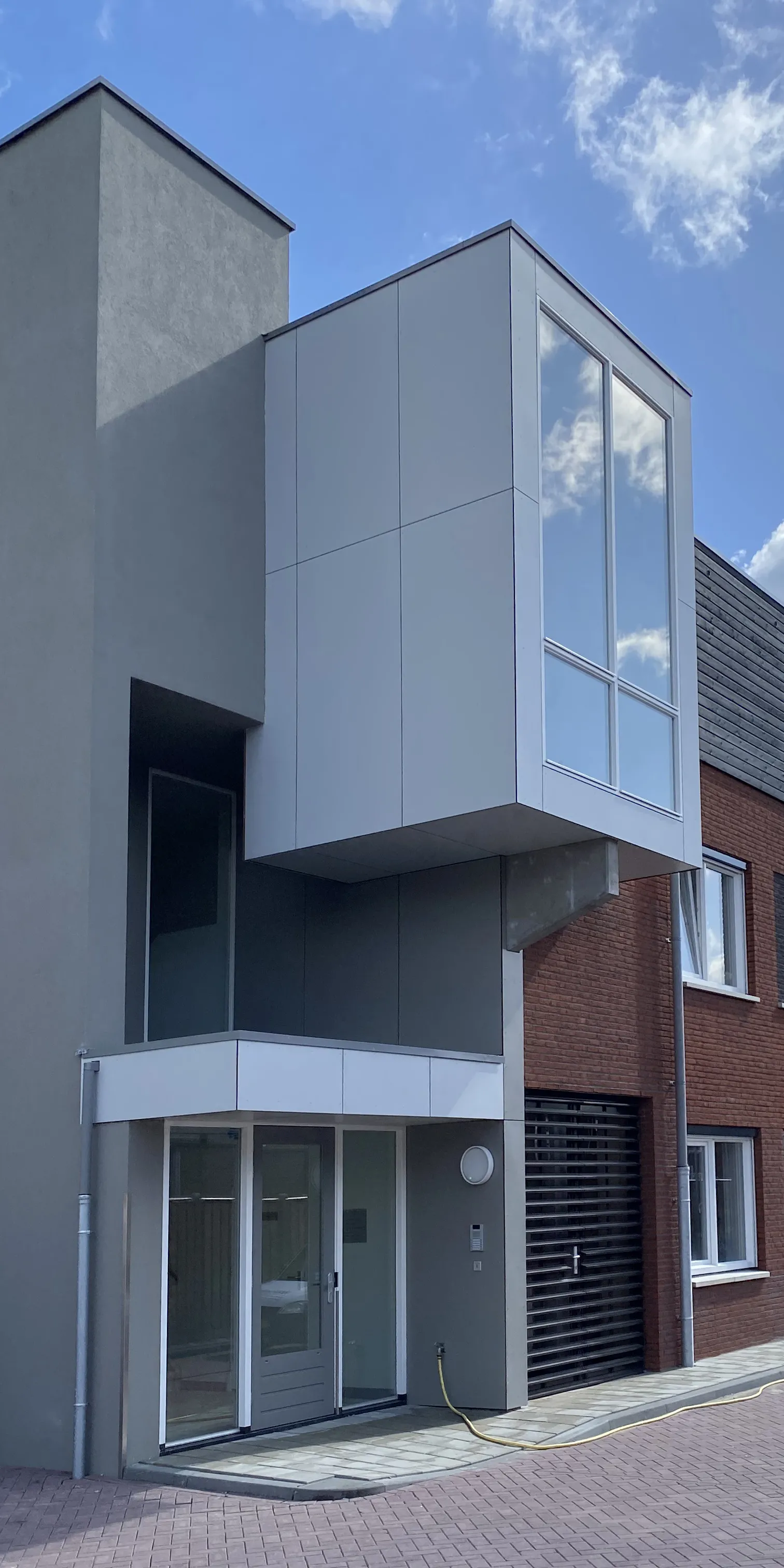 Stedelijke bebouwing in een historische context van 100 jaar geleden. Op de begane grond een kantoor voor Zeeuwse Gronden. De achtergevel ligt 1,5m lager waardoor een split-level oplossing is gerealiseerd met extra hoge ruimtes aan de Nieuwstraat. Op de verdieping 10 sociale huurappartementen. Eigenlijk driekamerwoningen met een verdieping.