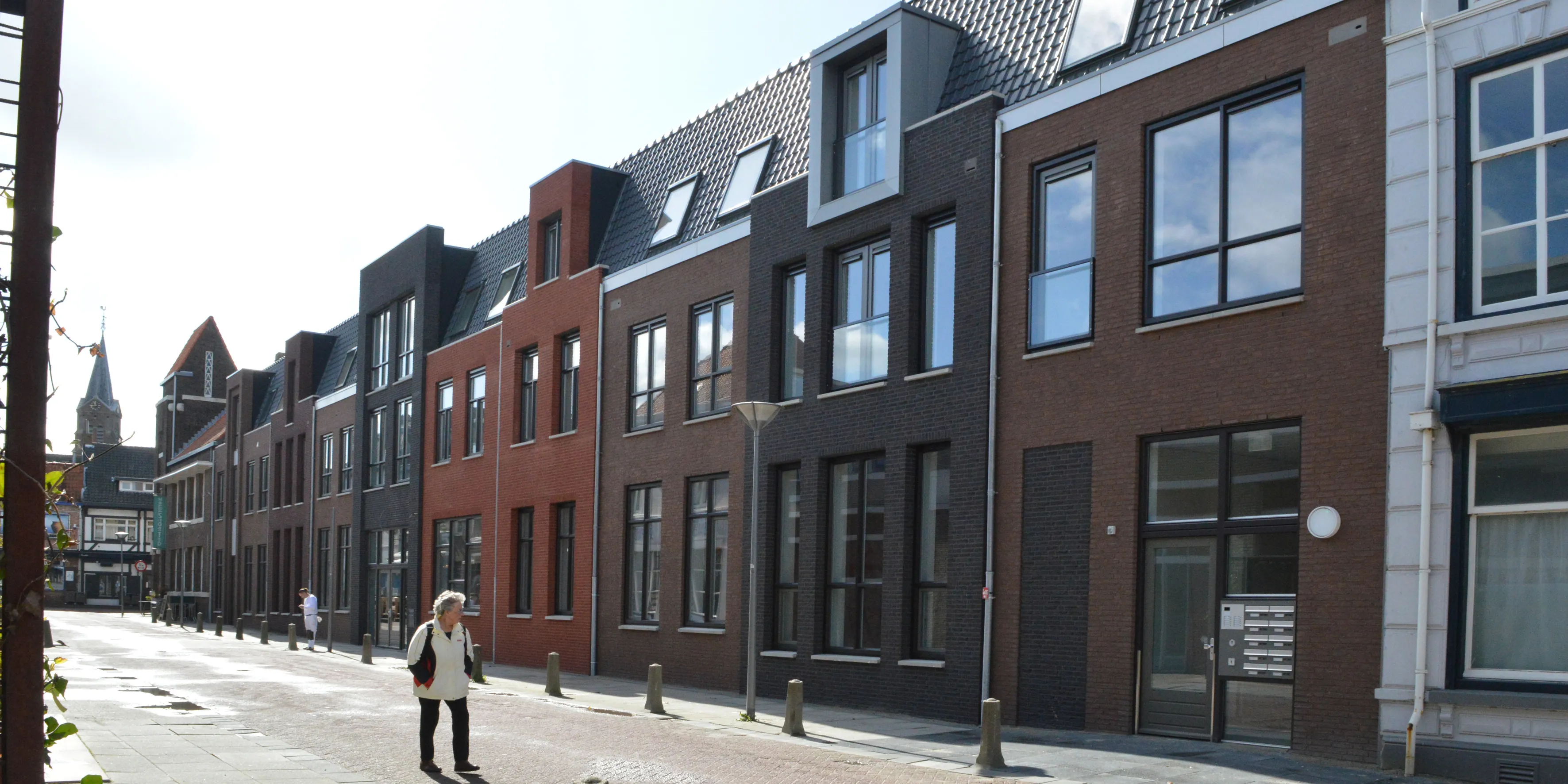“Een gevarieerde straatwand in historisch perspectief waarachter een plint met kantoren met daarop 10 sociale huurwoningen”