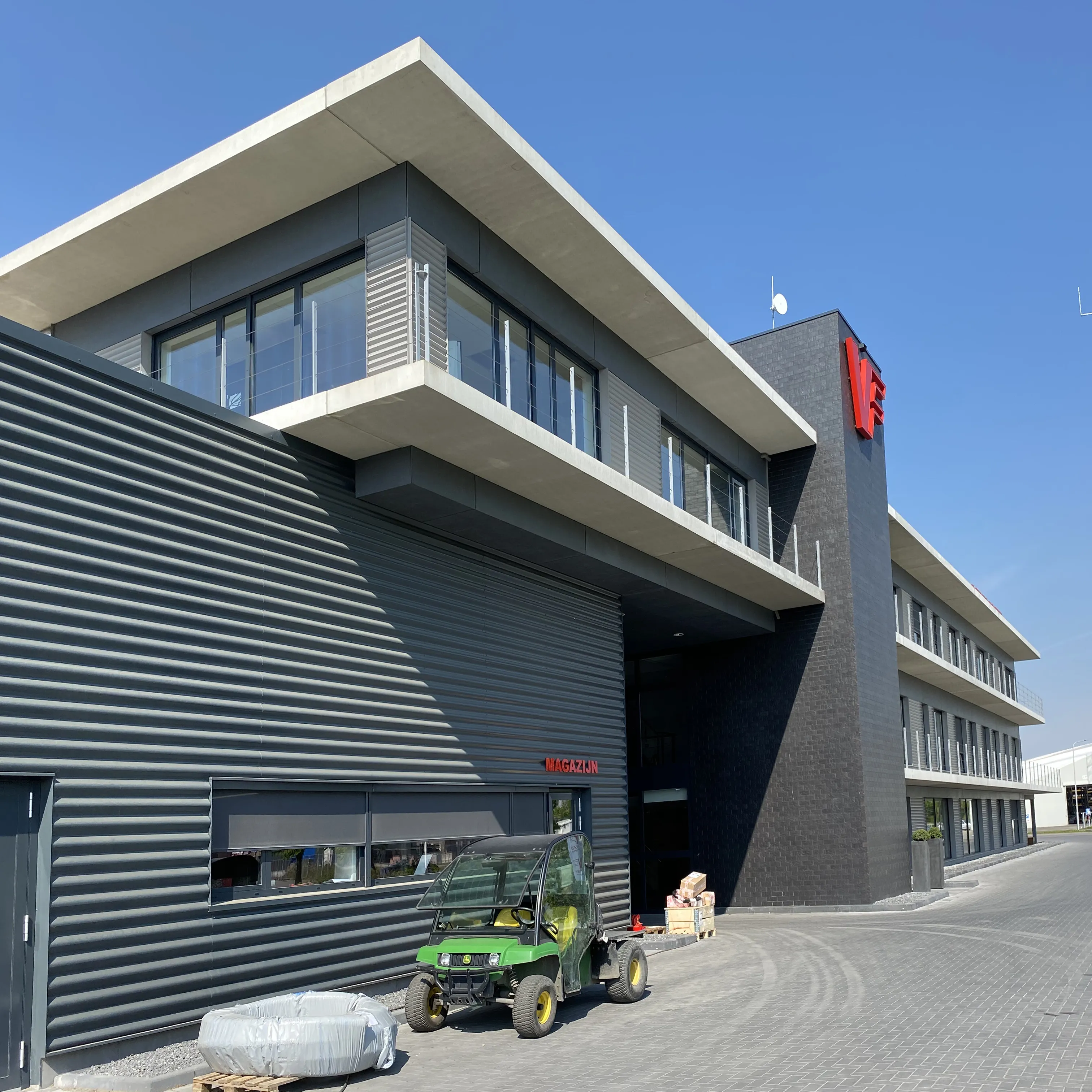 De grote fabriek waar zo'n 180 mensen werken aan de productie van bietenrooiers en mest-applicators had een bescheiden kantoor aan de rand van het pand. Een nieuw representatief kantoor en een goede kantinevoorziening geeft de bedrijfsvoering een boost. Routing van het bedrijfsproces bepaalden in hoge mate het ontwerp.
