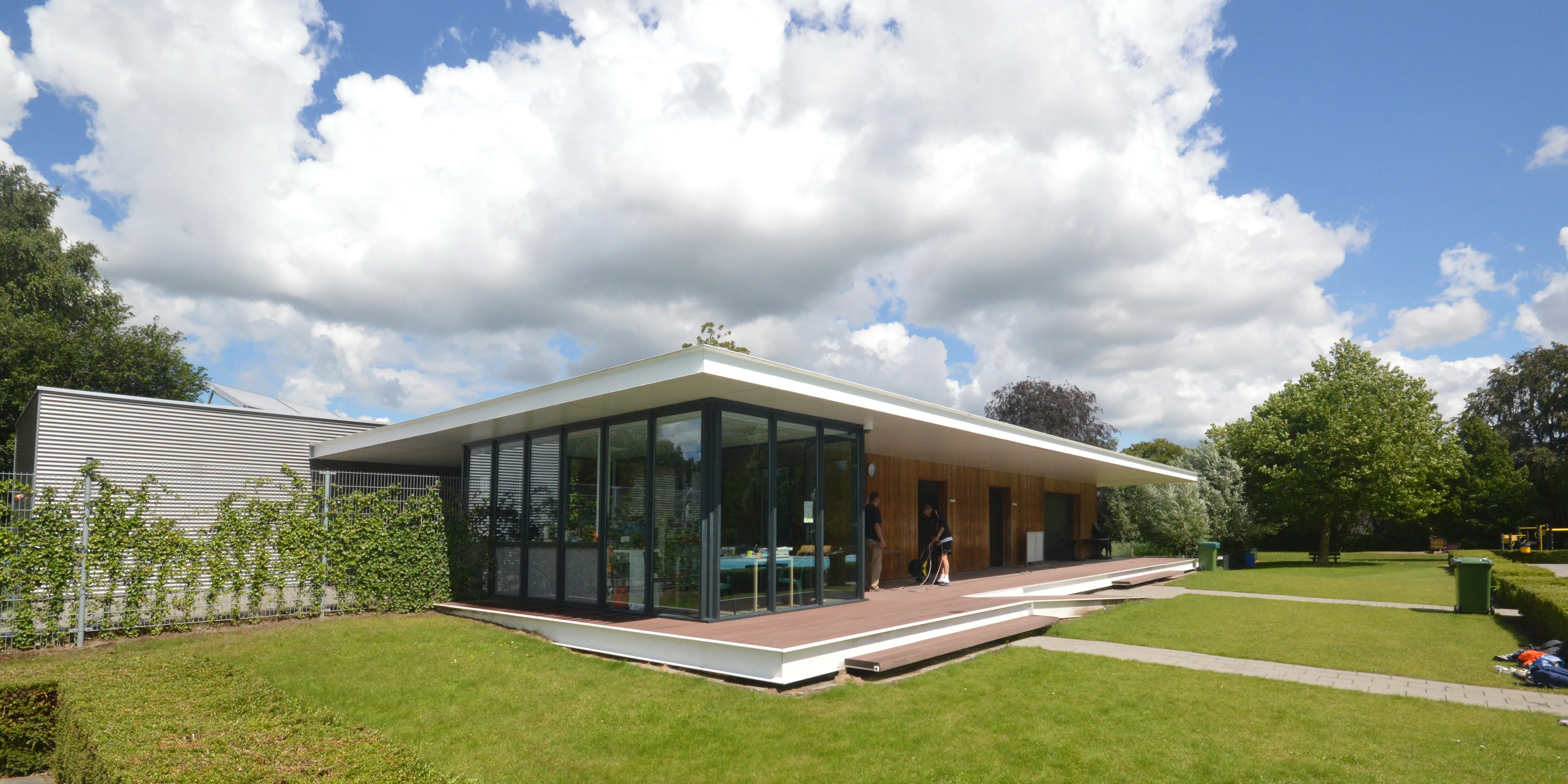De kleedruimtes van dit zwembad uit de jaren ’60 waren versleten. Een nieuwe accommodatie is als een modern paviljoen naast het zwembad gebouwd.
